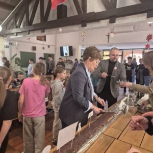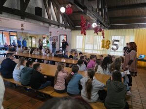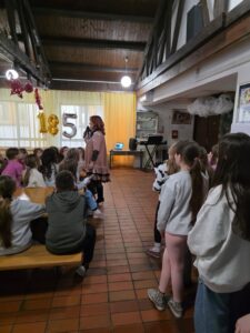 Svi zajedno otpjevali smo himnu naše škole i počastili se kolačem kojeg su izradile učenice na izvannastavnoj aktivnosti S kuhačom kroz život. Kolač je bio u obliku lente vremena na kojoj su bili obilježeni značajni događaji iz prošlosti kao i sadašnje generacije učenika i zaposlenika u školi.